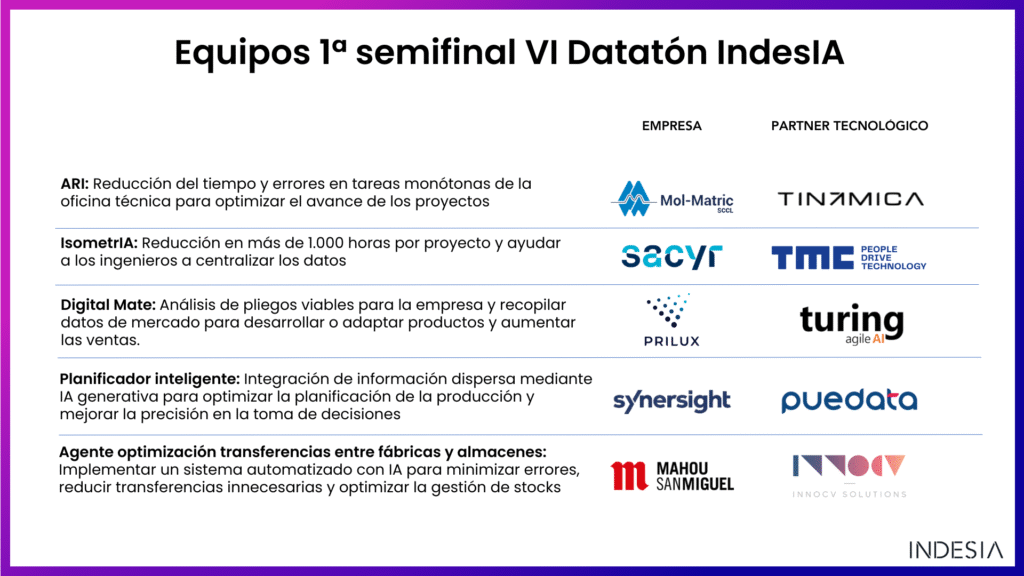 ¡Mecánicas Aparicio y Bravent se hacen con un hueco en la final del VI Datatón IndesIA! Su reto de predicción de tiempos de producción y chatbot analítico es el ganador de la segunda semifinal de esta ajustada edición, en la que el resultado se decidió en el desempate.